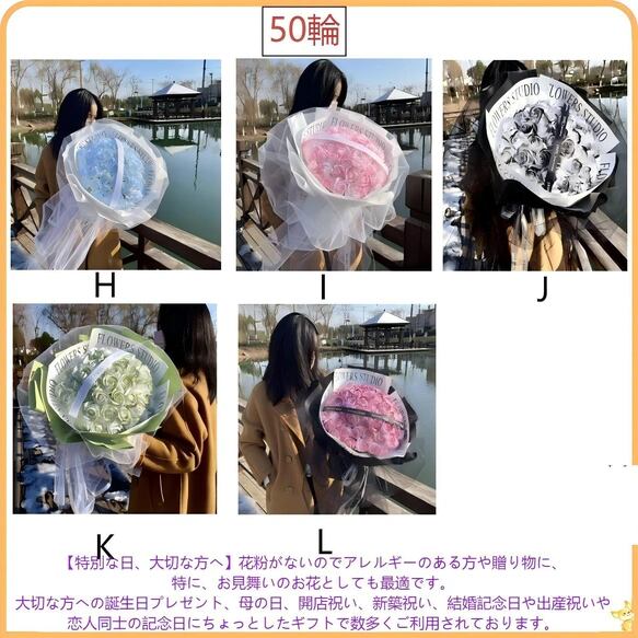 ご注意⇒ご注文の際に選択欄(2行目)には必ずご希望のバラ本数を選択する必要がございます。50本の花束をご希望された場合は、1行目は50本を選択してから、次のオプション欄には50本のタイプを選択してください。